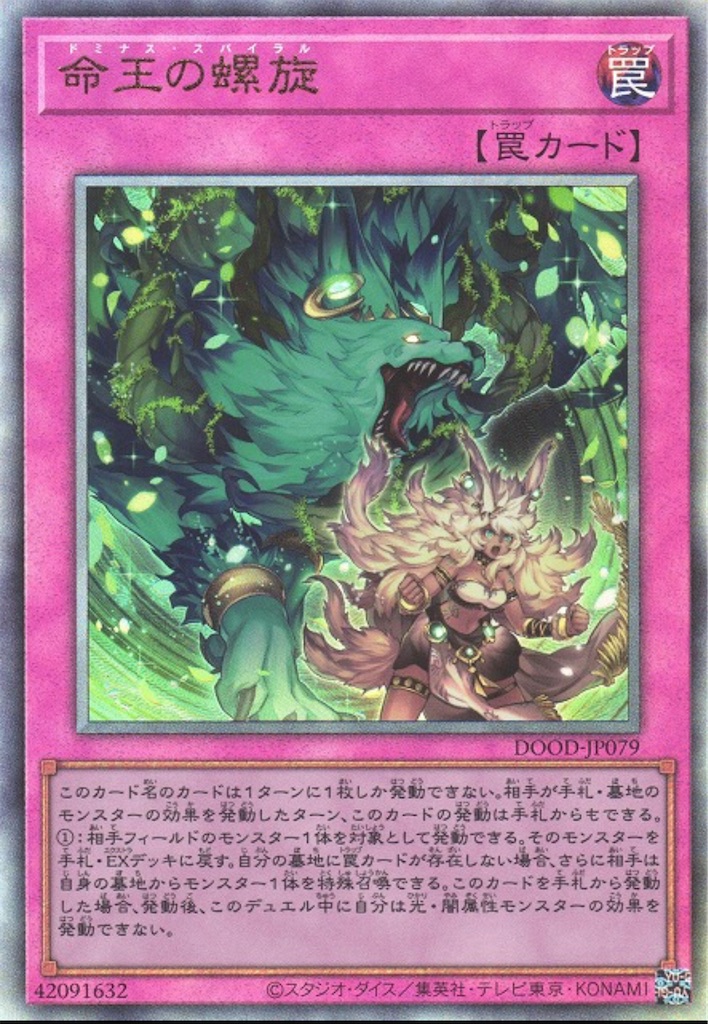 でデッキ構築を縛る必要がある。【転生炎獣】や【海皇】、【絢嵐】や【春化精】等のメインデッキやEXデッキを特定の色で染められるタイプのテーマに採用するのは面白そうですね。特に炎・水・風・地属性。これらのタイプのデッキならば『無限泡影』等もローリスクに採用出来る。ただ現状環境に届くレベルでドミナス・スパイラルと相性のいいテーマがいるのかと言われたら怪しいというのが事実としてある。もしかしたらこれから来るのかもしれないですね。現在の遊戯王でも若干の【ドミナス】格差が出来つつあるので何が起こってもおかしくない。