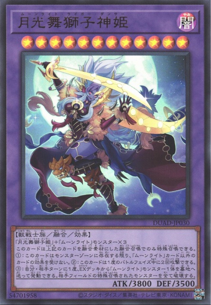 【デュエリスト・アドバンス】で強化された融合、リンク、エクシーズを駆使するテーマ。このテーマの強みはやはり【月光】以外のカード効果を受けない+全体除去を飛ばしてくる 『月光舞獅子神姫』の存在であり、これによって一部のテーマが召喚を許した時点で詰む可能性があります。攻撃力は脅威の3800ありダブルライガーまで行った時の絶望感は凄い。【VS】や【ヤミー】ですら苦戦するポテンシャルを秘めていると考えると面白いテーマの1つだと思いますね。ライガーに行ければ大きく勝ちに近づくため『多層融合』や捲りで『冥王結界波』を採用する構築もあるとか。