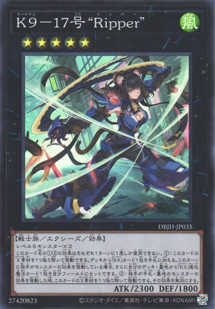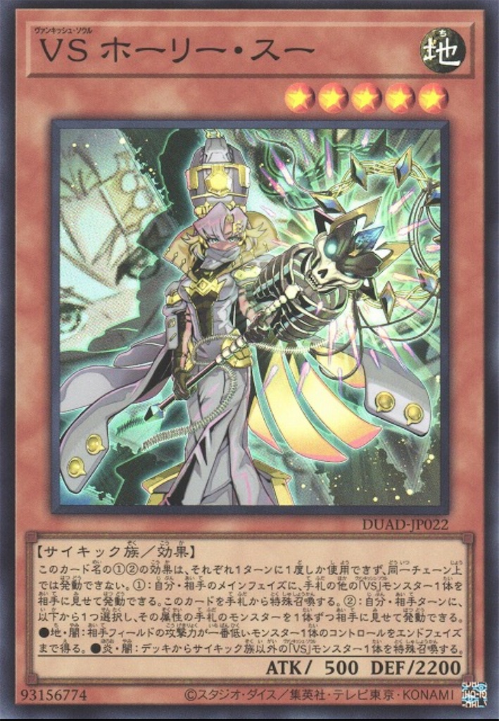【VS(ヴァンキッシュ・ソウル)】の中速戦と強さにK9ギミックを組み合わせた制圧デッキ。VSの展開が十分な時にリッパーを経由して更にランク5展開に繋げる事を得意とするデッキですね。VSの展開の要である 『VS ホーリー・スー』や 『VS 蛟龍』が☆5であるため 『闘神の虚像』で回収出来る時やヨクルによる上振れが狙えるたり、一部の手札誘発モンスターと相性がよかったりする点も強い要素ではありますが、このデッキ最大の強みは『VSホーリー・スー』による後攻0ターン目展開の質の高さですね。スーの効果でVSラゼンを展開する事でこちらの動きを完成させつつスーがいる場所以外のモンスターに干渉する事が出来ます。VSヘヴィ・ボーガーやヴァリウスをラゼンでサーチして①の効果で入れ替える事でVSの炎闇地の布陣が簡単に揃うのが非常に強いですね。これによって【K9】ギミックがなくともVSというテーマだけである程度戦えるようになっています。現在はファンタズメイやインパルス→ファイアアタッカー、鎖龍蛇スカルデット等を採用して手札の質を上げる構築が増えてきていますね。エクストラだと『 K9-666号 “Jacks”』を採用している人も。