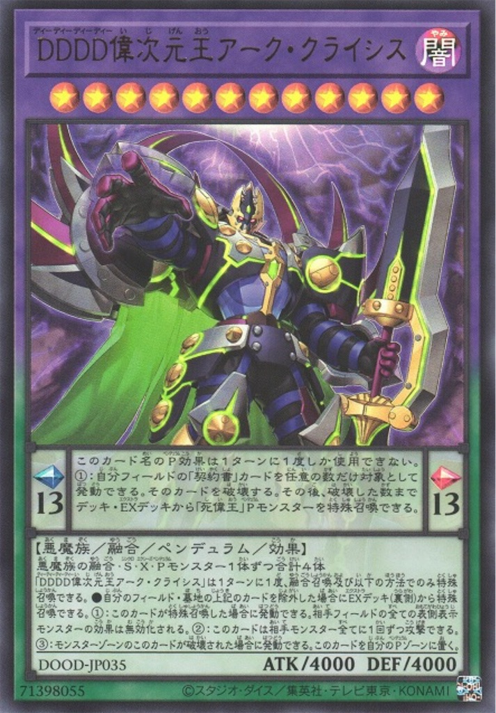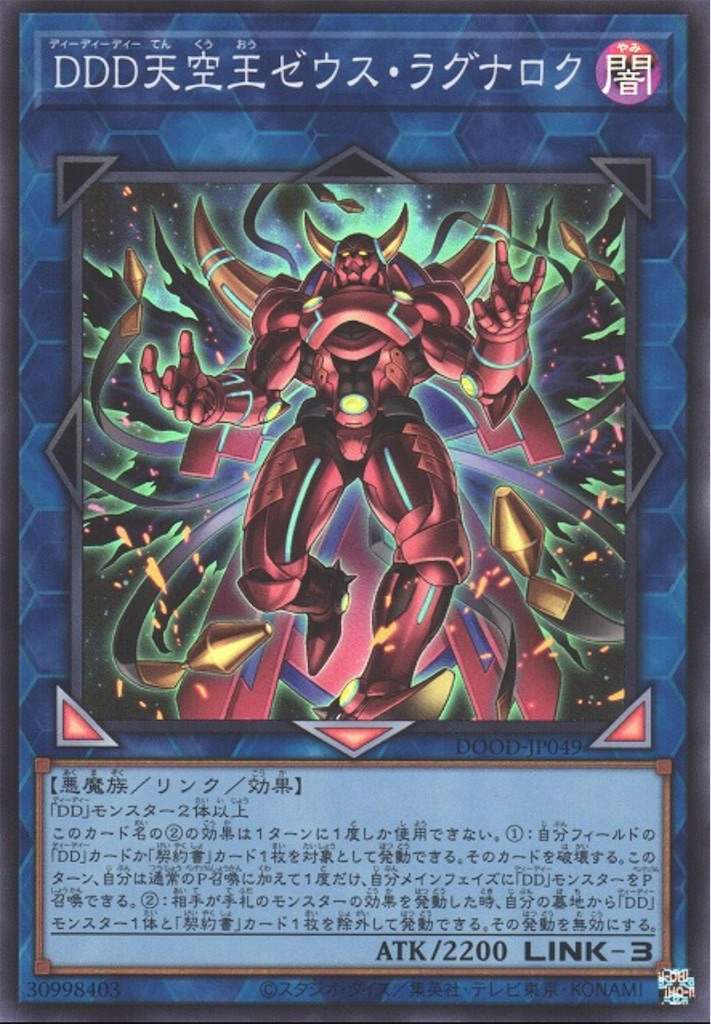 【ドゥーム・オブ・ディメンションズ】で強化された融合・シンクロ・エクシーズ・リンク召喚を駆使して戦う制圧デッキ。ゼウス・ラグナロクの手札のモンスター効果無効化やエグゼクティブシーザーによって一部の誘発に耐性がある点やリソースが残っていれば 『DDDD偉次元王アーク・クライシス』によって一気にライフが取り切れる点が強いですね。魔法罠を無効化出来る『 DDD呪血王サイフリート』が地味に偉く硬い盤面を作る事が出来ます。先行制圧を返せなければ ☆8【DD】×2で『DDD双暁王カリ・ユガ』を作り相手カードを封殺しつつアーククライシスでライフを取る動きが出来るのは面白いですね。闇属性のテーマなので『霊王の波動』も採用出来る。