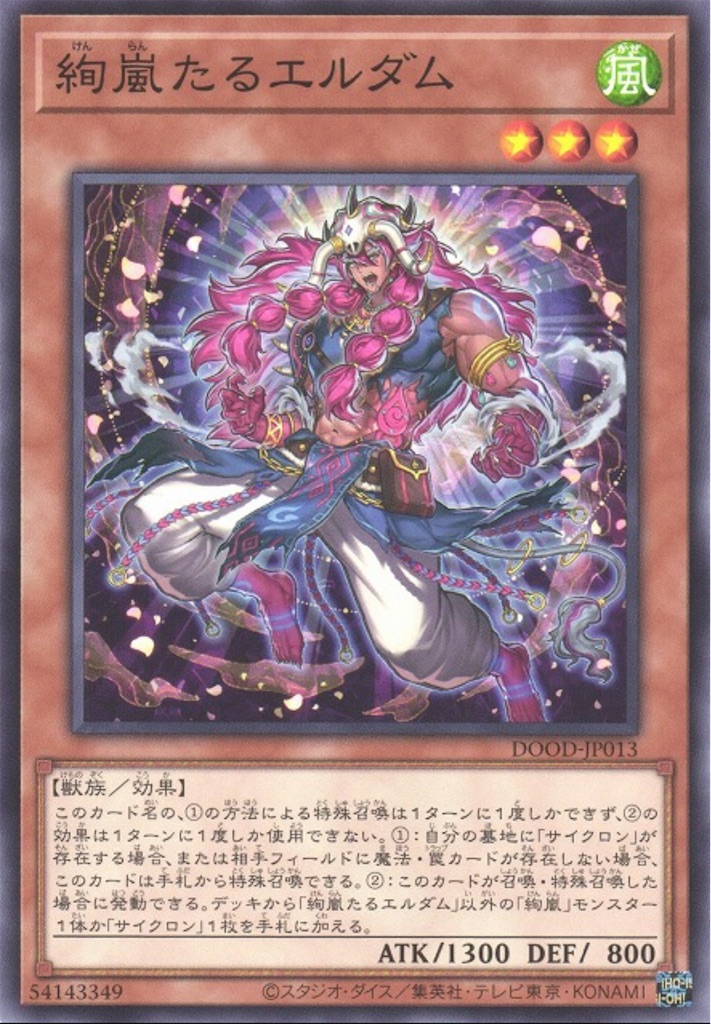 現在よく見かけるのは 『絢嵐たるエルダム』と 『絢嵐たるスエン』、 『絢嵐たる献詠』、『サイクロン』のセットですね。【絢嵐】モンスターを手札に加える効果を持つエルダムからならスエンを手札に加えて特殊召喚でいいし、スエンからなら